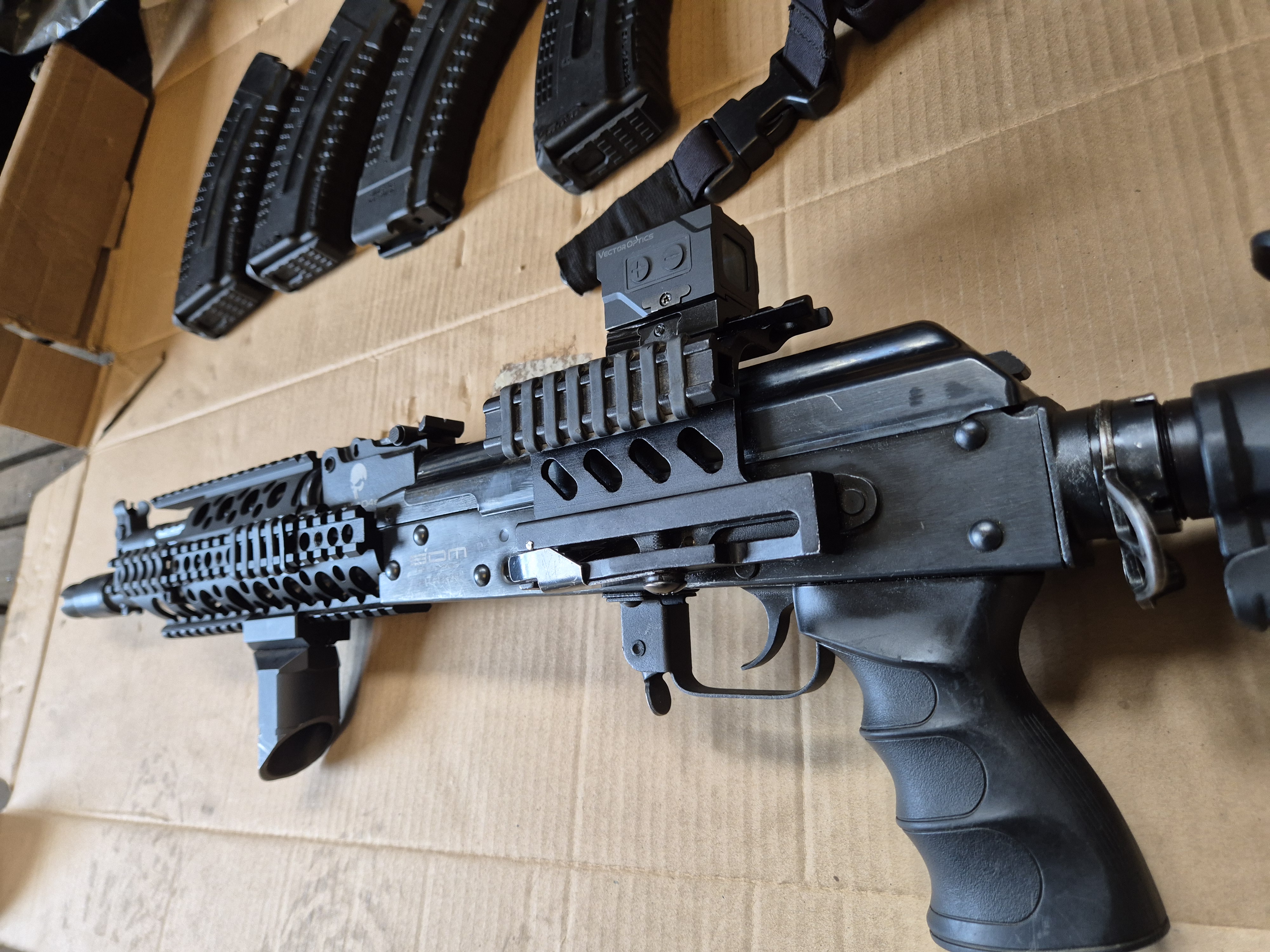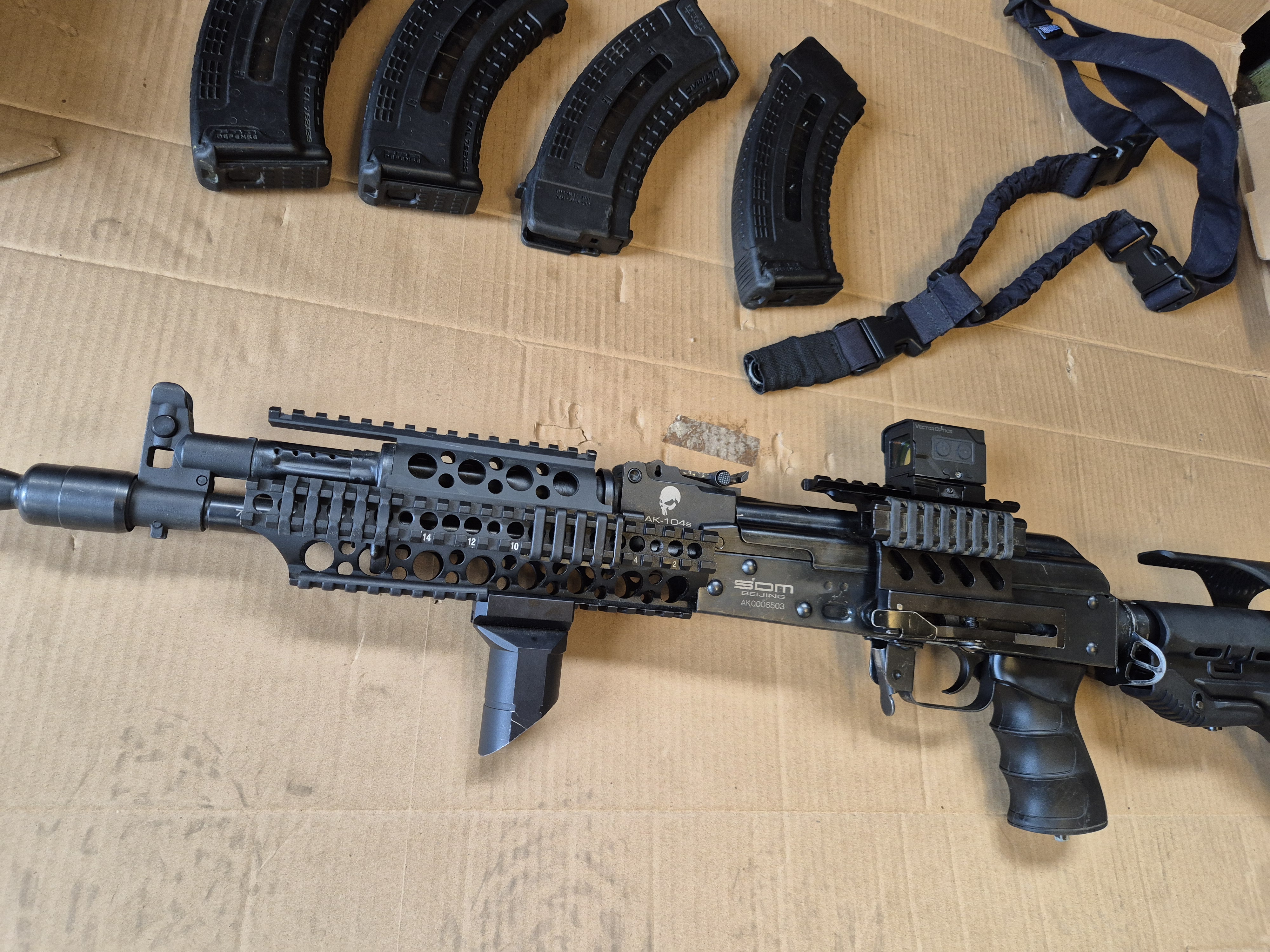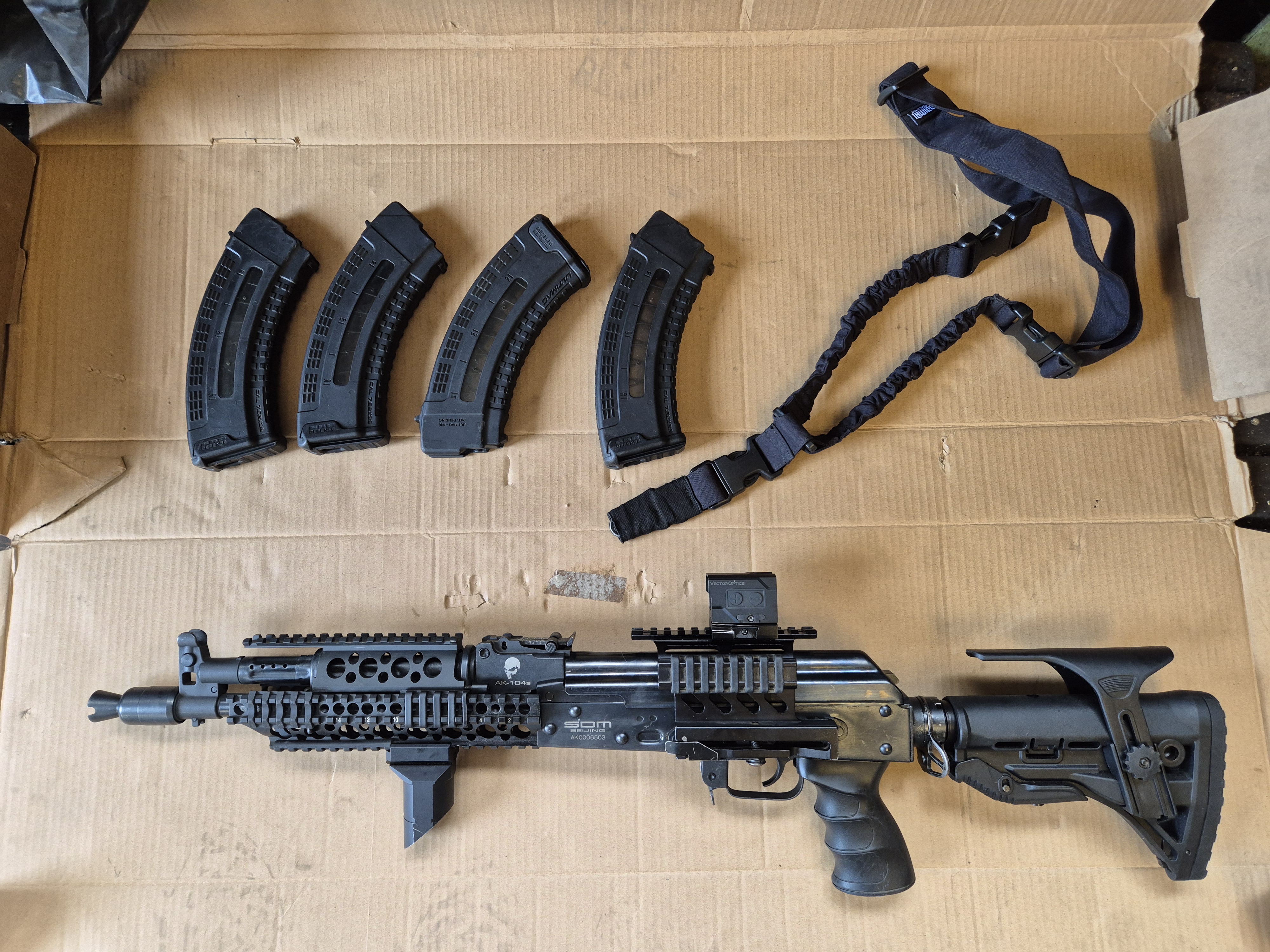 Eladó egy SDM AK-104 -es Karabély, a legendás 7.62X39-es kaliberben. A modern AK-104-esekre jellemző szerelékes előagy, állítható válltámasz, infrabak red dot tartó, Vector Optics red dot, Zenitco előagy markolat van rajta. 4db FAB Defense tárral, szíjakasztókkal, szíjjal. B9